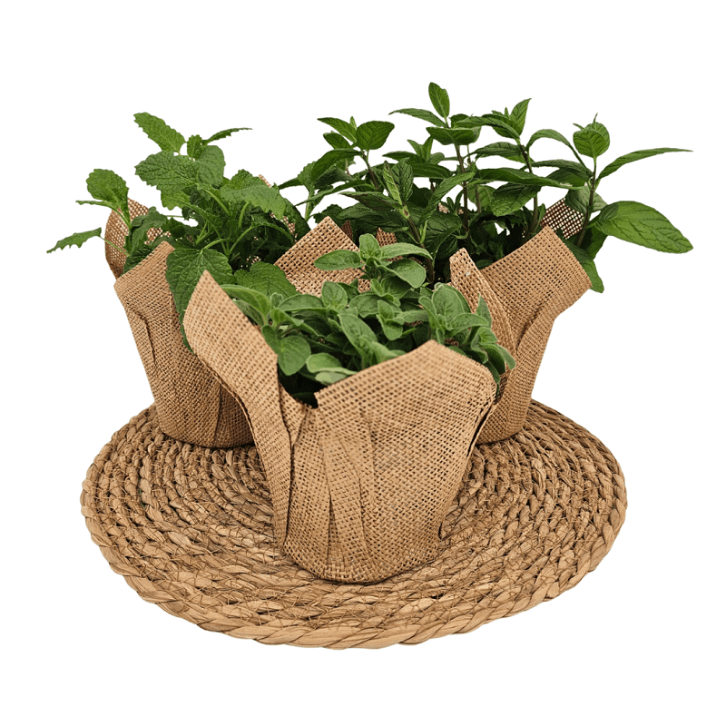 צמחי תבלין עיצוב לשולחן- מארז עיצוב שולחן עם 3 צמחי תבליני העונה, יוטה ופלייסמט קש – מתנה מושלמת לאירועים